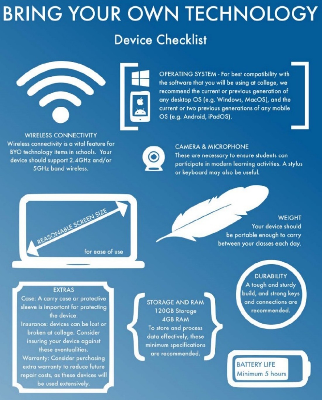 There is no list of mandatory or preferred BYOT (Bring Your Own Technology) devices, but students and parents may consider the following information when deciding which type of device may be the most appropriate for the subjects to be studied.