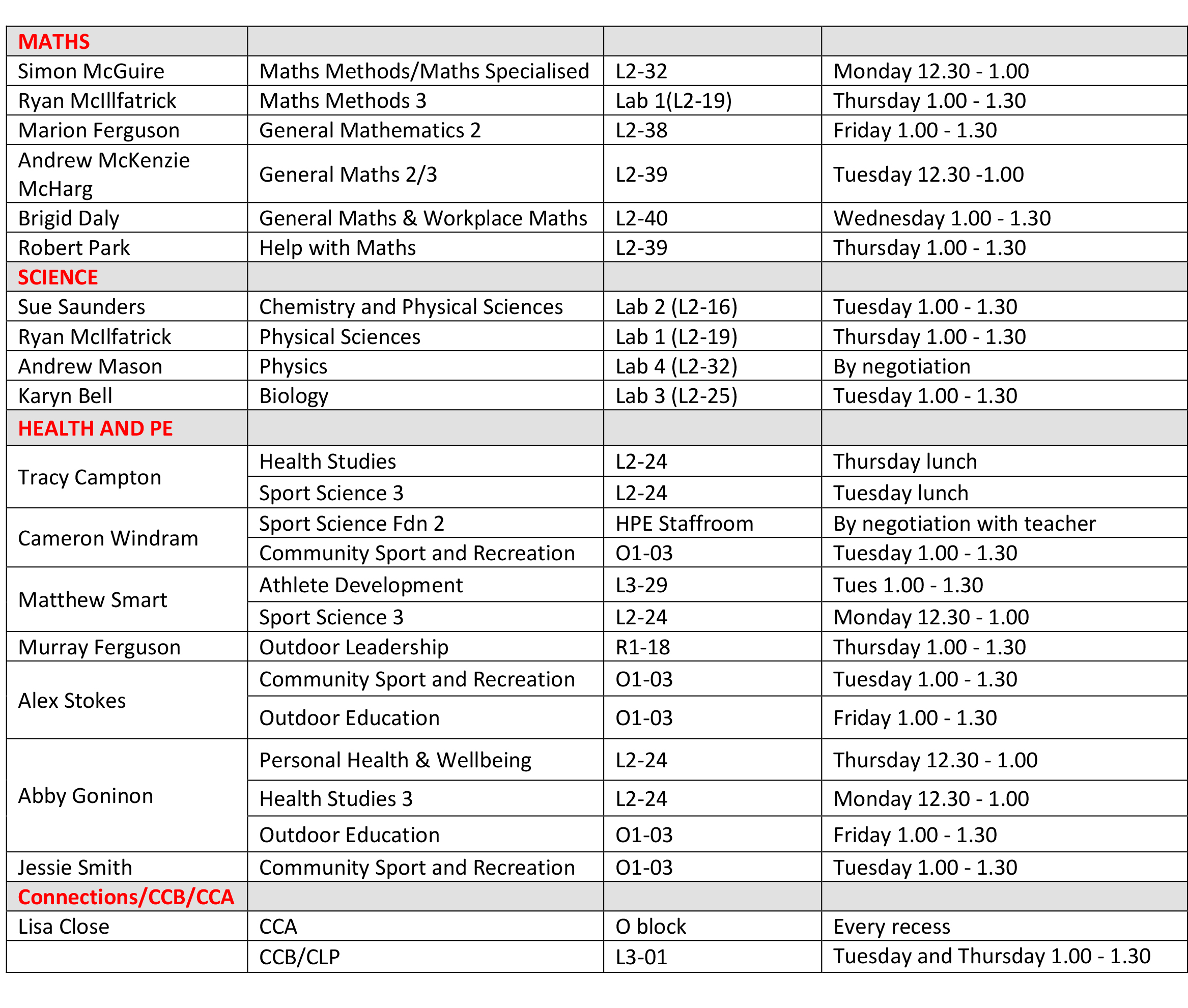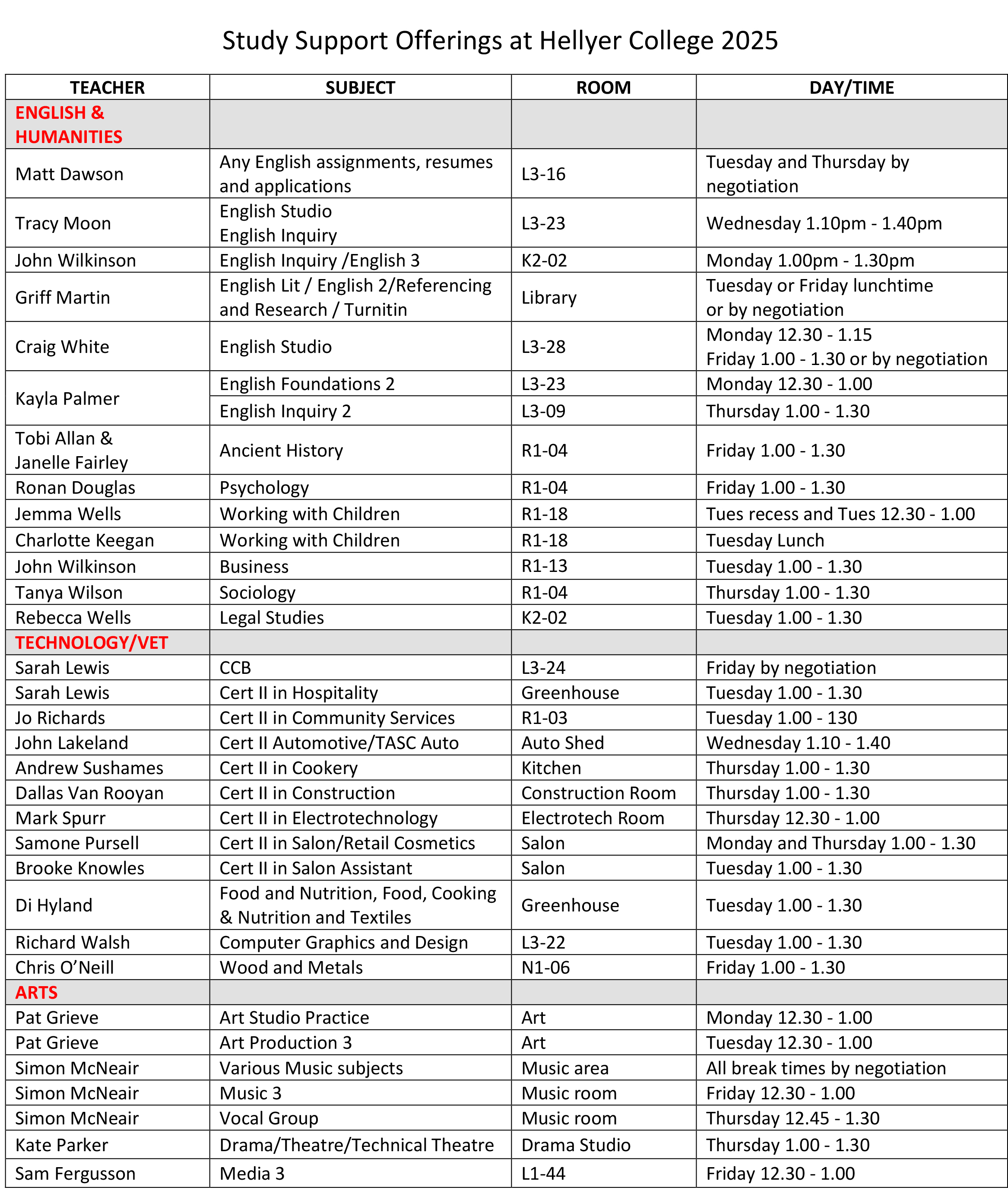 A schedule for study support across the different subjects is published early each term and is advertised on our College Facebook page and student notes. It is also sent home to parents via text.